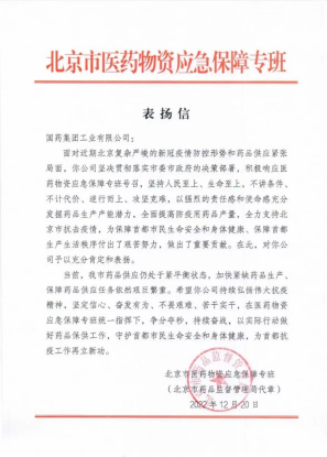 国药容生收到中华人民共和国工业和信息化部慰问信