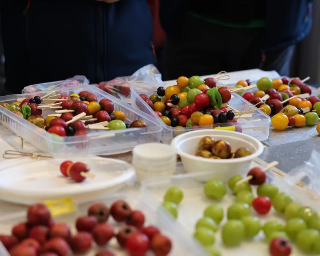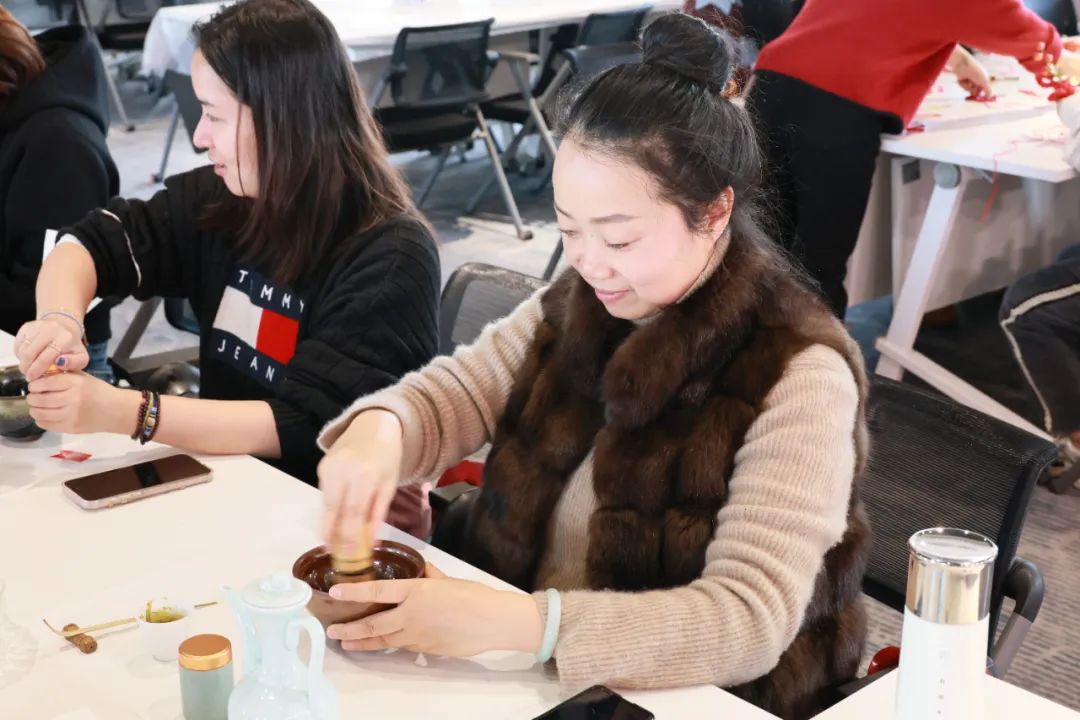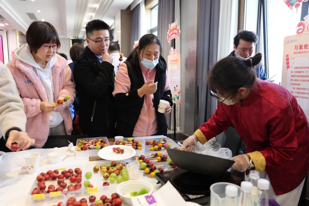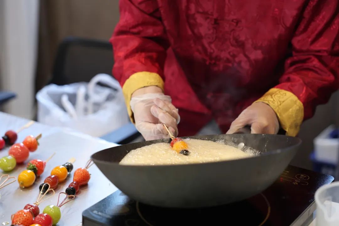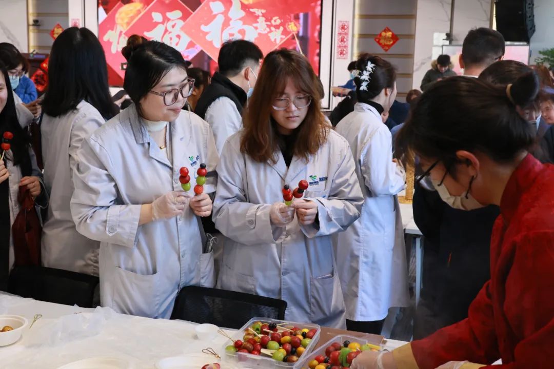 冰糖葫芦制作体验区,红火甜蜜的糖葫芦吸引着员工们排起了长长的队伍,粘上热腾腾的糖水,感受甜蜜的年味。