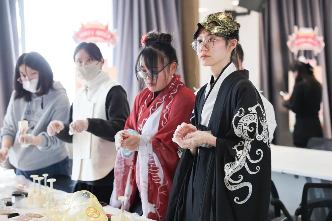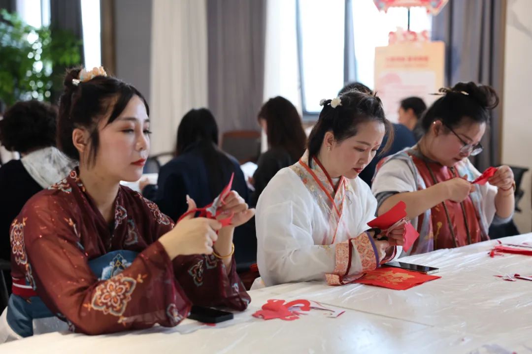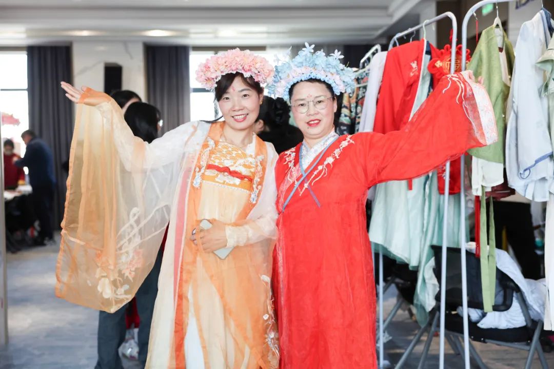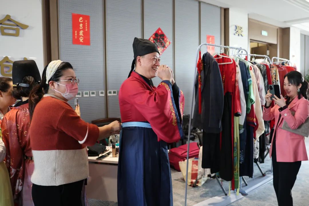 汉服体验区,员工们换上精美的汉服,仿佛穿越到古代,或翩翩起舞,或低眉含笑,举手投足间尽显古人的浪漫与风雅。身着汉服的员工们成为了游园会上一道亮丽的古韵风景线。