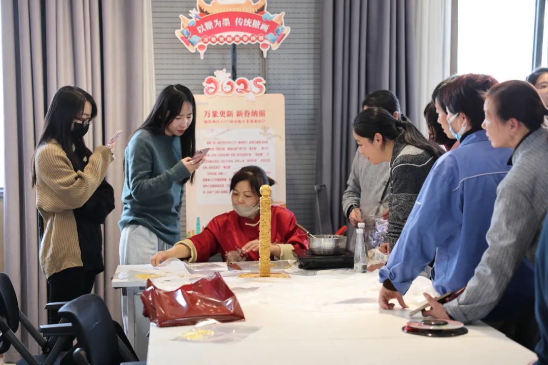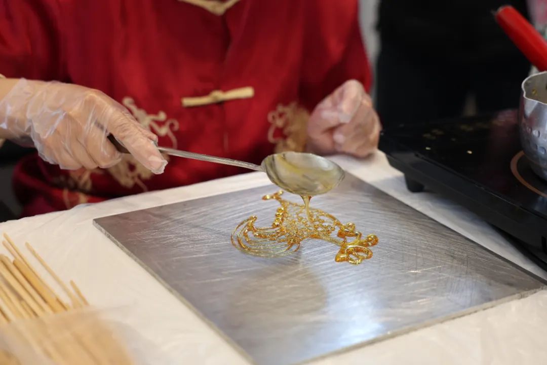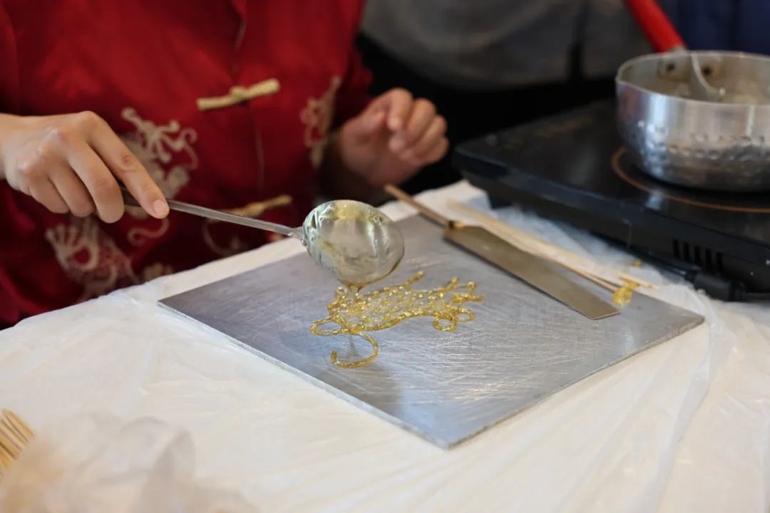糖画艺人,以糖为墨,手法灵活地在光洁的石板上勾勒出一幅幅栩栩如生的图案,员工手捧精美的糖画,笑颜如花,品尝着甜蜜与幸福的滋味。