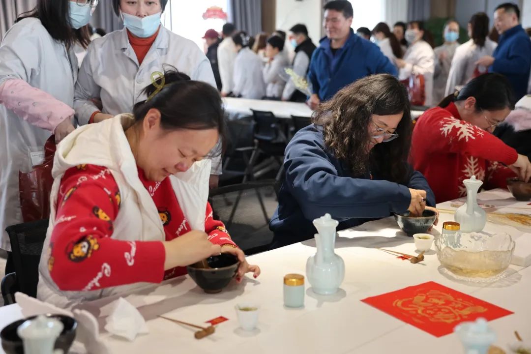 宋韵点茶区,茶艺师们身着传统服饰,手法娴熟地以古法点茶,吸引着对茶艺饶有兴趣的员工们。