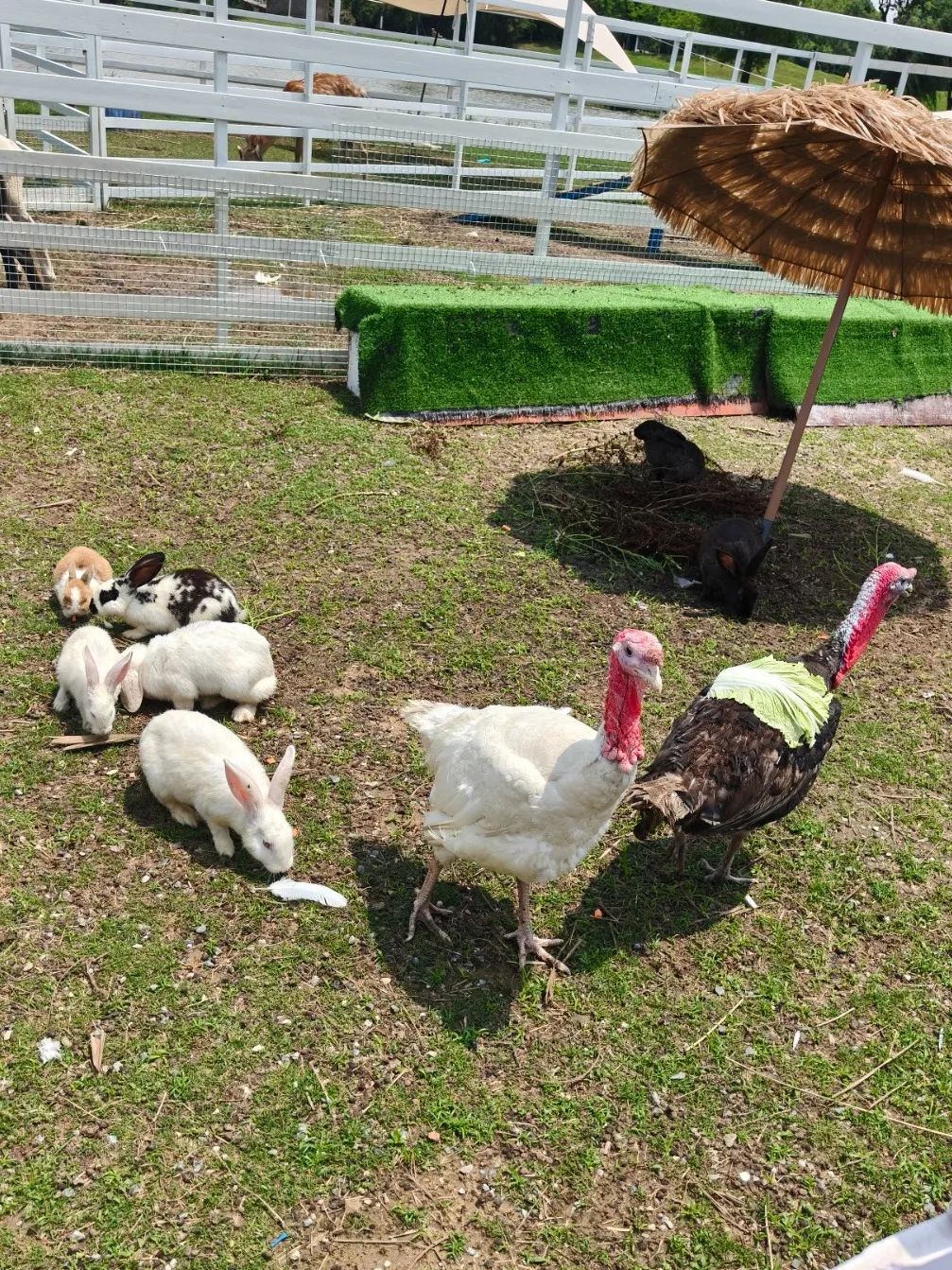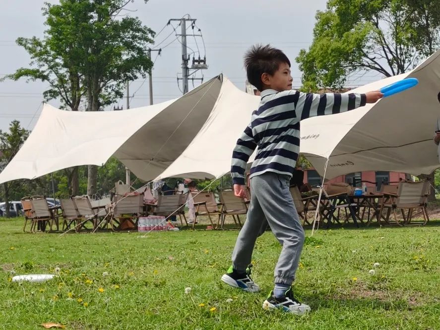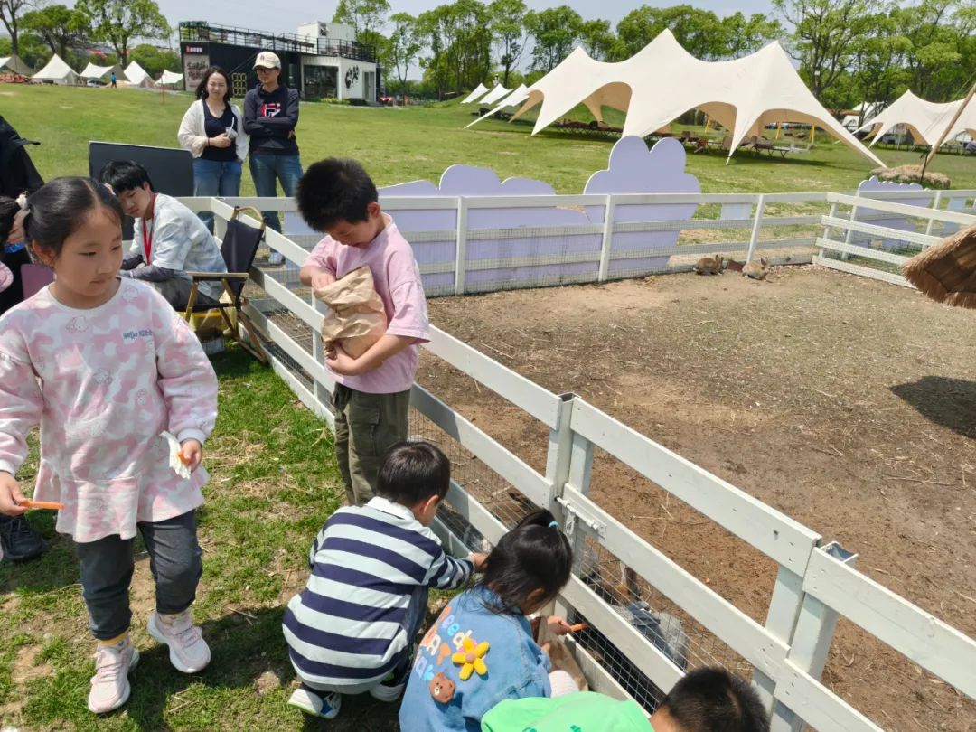 露营区的草坪变成了欢乐的海洋,飞盘在空中划出银色的弧线,孩子们踮起脚尖跳跃接盘,草坪上的身影如小鹿般轻盈灵动;经典游戏 "老鹰捉小鸡" 里,"老鹰" 张牙舞爪地左突右冲,"母鸡" 则张开双臂紧紧护住身后的 "小鸡",孩子们的尖叫与笑声此起彼伏;"老狼老狼几点了" 的稚嫩呼喊中,孩子们随着 "老狼" 的回答一步步靠近,当喊出 "开饭啦" 时,便像小火箭般四散奔跑,童真的快乐在追逐中无限蔓延。部分小朋友欢快地蹲在围栏旁,轻轻将鲜嫩的青草递给毛茸茸的小兔子,看它三瓣嘴快速咀嚼;又抓起玉米粒撒向火鸡群,红脖子的火鸡扑棱着翅膀,咯咯叫着争食。