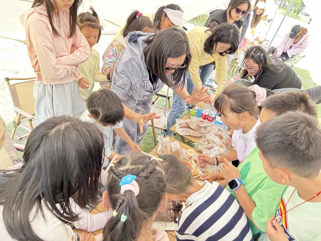 玩累了的孩子们围坐在露营桌旁,迎来了最期待的 "甜蜜时刻"。当巧克力蛋糕闪亮登场,孩子们的眼睛都是亮晶晶的。大家你一口我一口,巧克力的丝滑、浓郁的奶味在舌尖绽放。包装袋的沙沙声里,薯片、糖果、饼干在小手间传递,零食的自由也可以成为节日里最简单的小幸福。