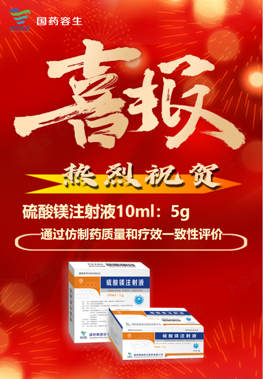 捷报频传,再获佳绩。近日,子公司国药容生收到国家药品监督管理局核准签发的《药品补充申请批准通知书》,批准硫酸镁注射液增加10ml:5g规格的补充申请,并通过仿制药质量和疗效一致性评价。