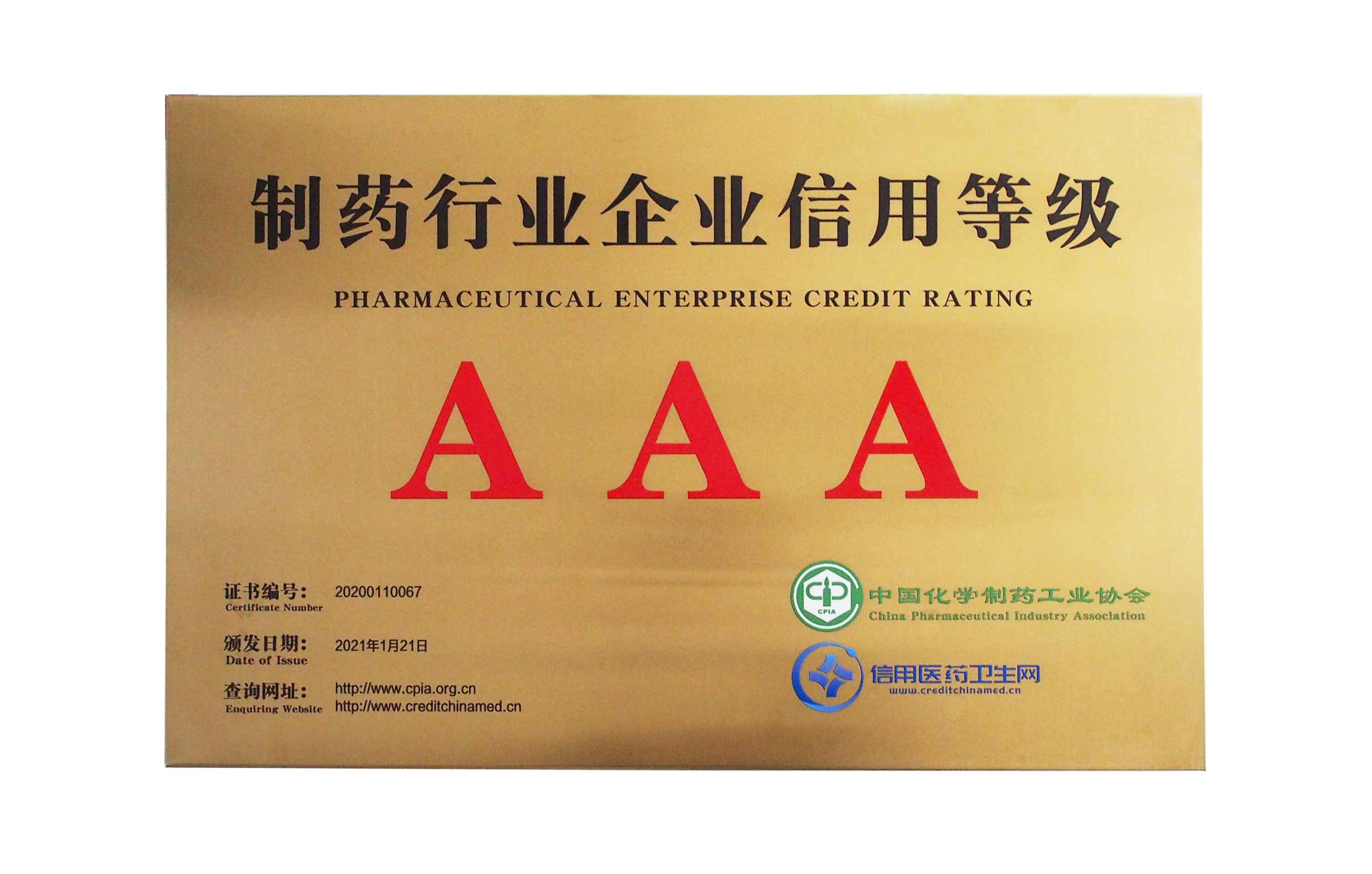 现代-2021年度全国制药行业-企业信用等级AAA-铜牌...