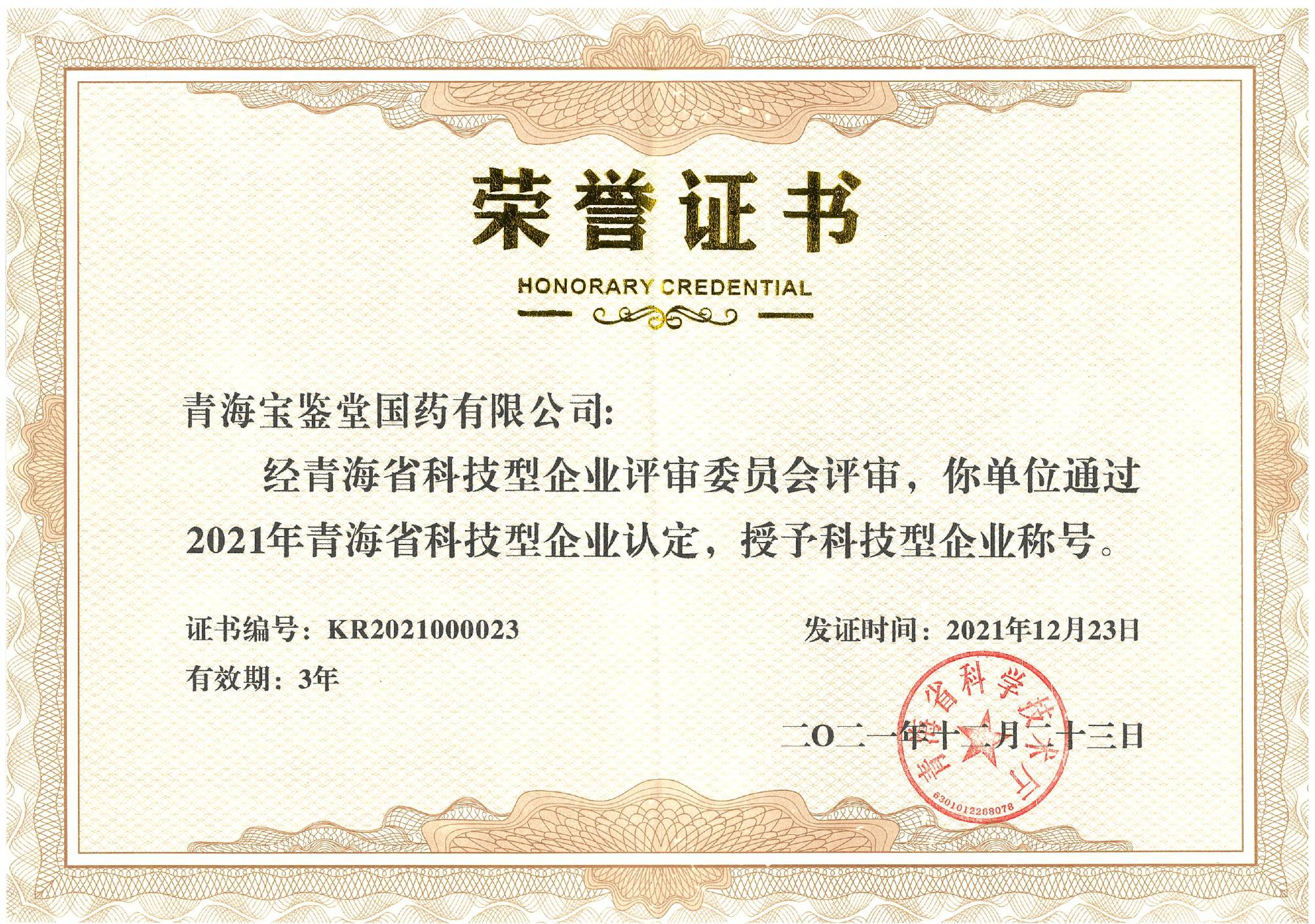 宝鉴堂-青海省科技型企业认定荣誉证书-青海省科学技术...