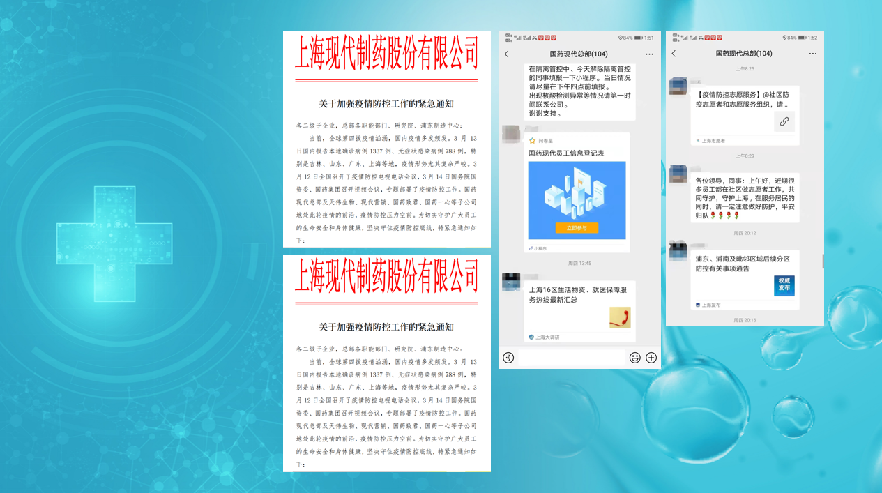 在国药现代党委领导下,国药现代疫情防控工作领导小组及工作小组快速反应,明确领导及各部门职责分工,根据总部搬迁至浦东新区的实际情况,动态调整总部疫情防控工作预案。3月11日以来,先后3次下发专项通知,从日常管理到重点生产任务安排,统筹疫情防控与生产经营。