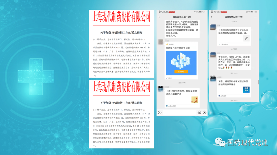 3月,国药现代总部和地处上海、广州深圳、吉林长春等地各子企业地处此轮疫情前沿,防疫防控压力空前。在党中央的坚强领导下,在国药集团党委和各地上级党组织的带领下,国药现代党委加强组织领导,充分担起防控主体责任,始终紧绷疫情防控这根弦,始终坚持“动态清零”防控方针不放松,始终坚决守住不发生疫情规模性反弹的底线。