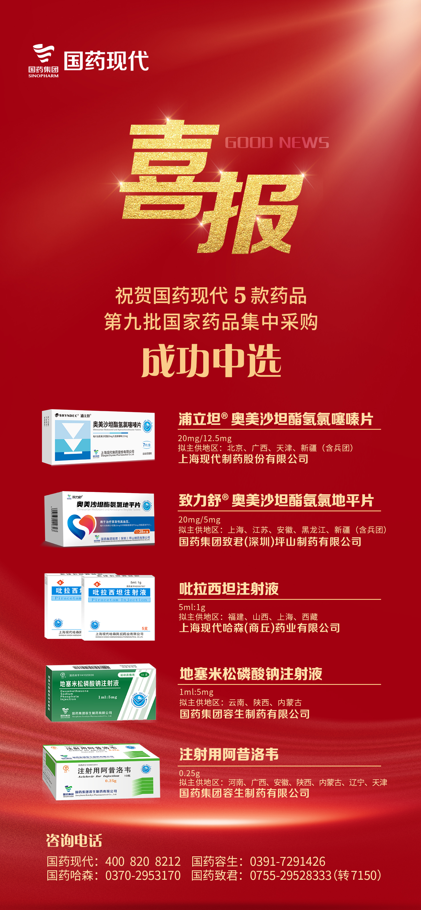 2023年11月6日,第九批国家药品集采在上海市奉贤区解放东路开标。国药现代和旗下国药致君、国药容生、国药哈森3家子公司共5个品种全部成功中选。