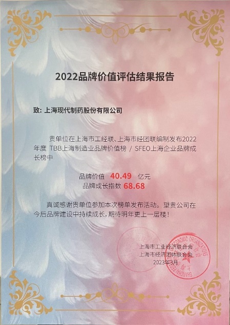2022年5月中国品牌日活动期间,2023TBB/SFEO上海品牌价值系列榜单在首届中国制造发展论坛暨第九届中国品牌经济(上海)论坛上正式发布,国药现代(600420)连续两年成功入选“TBB上海制造品牌价值榜”。