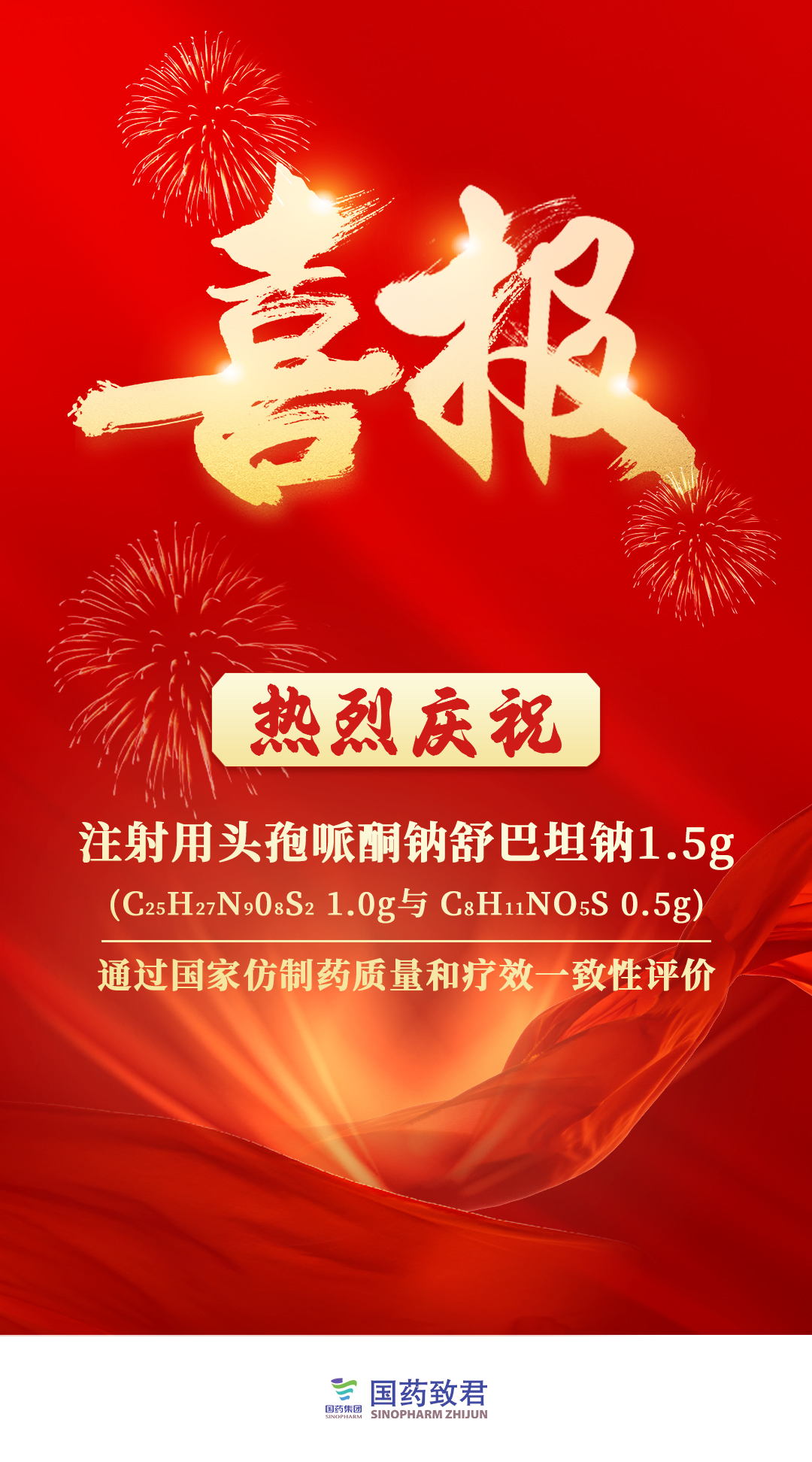 近日,国药致君收到国家药品监督管理局核准签发的《药品补充申请批准通知书》 ,批准注射用头孢哌酮钠舒巴坦钠1.5g(C₂₅H₂₇N₉O₈S₂ 1.0g与C₈H₁₁NO₅S 0.5g)通过国家仿制药质量和疗效—致性评价。至此,公司已有17个注射剂品规通过一致性评价。