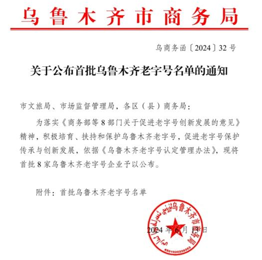 近日,乌鲁木齐市商务局公布了首批“乌鲁木齐老字号”认定名单。子公司国药新疆荣耀上榜,成功荣获“乌鲁木齐老字号”称号。