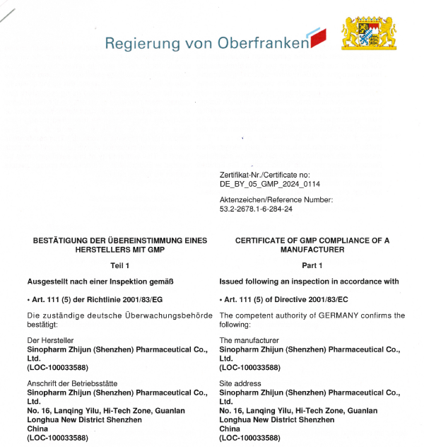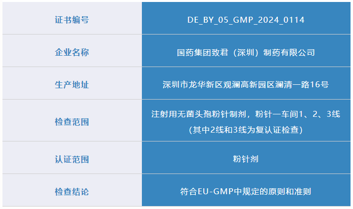近日,国药现代控股子公司国药集团致君(深圳)制药有限公司(以下简称国药致君),收到德国相关监管机构(Bundesinstitut für Arzneimittel und Medizinprodukte,以下简称BfArM)颁发的GMP证书,国药致君粉针一车间1线首次通过EU-GMP符合性检查。