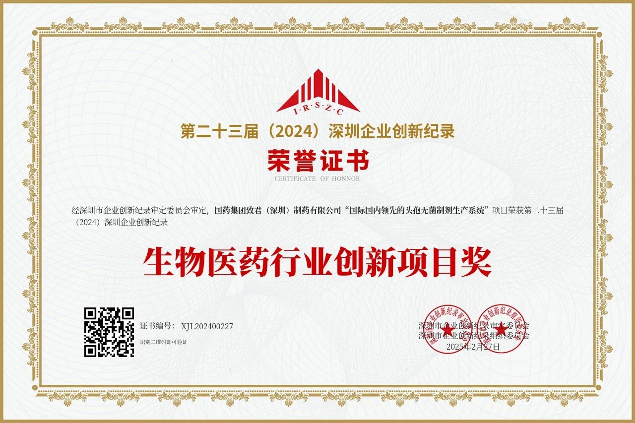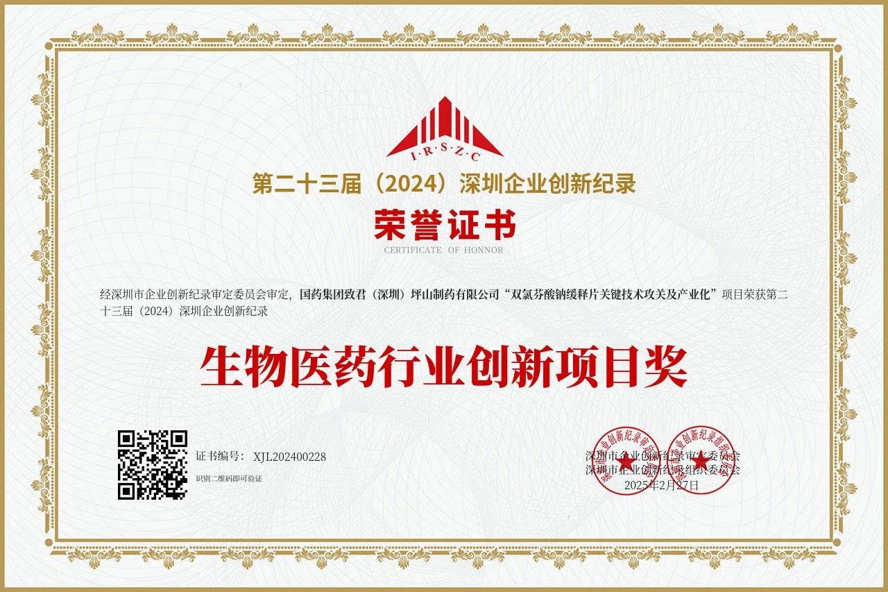 近日,第二十三届深圳企业创新纪录及2024湾区企业创新力榜单等重磅奖项揭晓,子公司国药致君和国药致君坪山荣获“第二十三届深圳企业创新纪录——自主创新标杆企业”称号,并分别凭借“国际国内领先的头孢无菌制剂生产系统项目”和“双氯芬酸钠缓释片关键技术攻关及产业化项目”摘得本届行业创新项目奖,在本次审定的216个项目中,仅有25个项目获此殊荣,而生物医药领域仅有4个项目获奖,充分彰显了国药致君和国药致君坪山在深圳生物医药领域的创新领先地位。