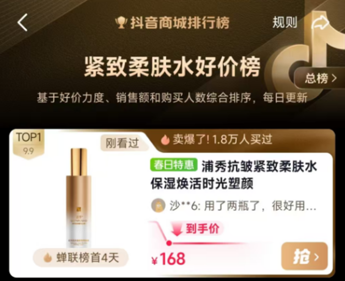 2025年,浦秀品牌荣获第29届CBE美妆好品牌称号,旗下产品时光肌抗皱紧致柔肤水荣登过抖音商城紧致柔肤水好价榜TOP1,旗下产品氨基酸净澈洁颜蜜入选上海市总工会采购推荐名单。
