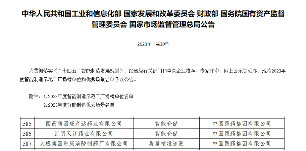 国药威奇达“智能仓储”项目入选2023年度智能制造优秀场景