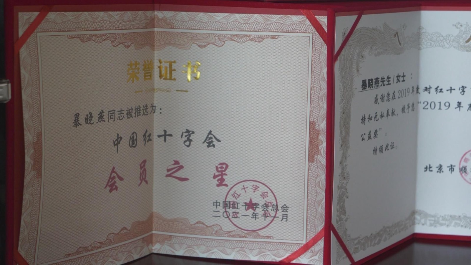 2019年、2020年暴晓燕被顺义区红十字会评为“人道公益”奖,2021年被中国红十字会评为中国红十字会“会员之星”荣誉称号,2022年被北京市红十字血液稀有血型爱心之家评为“奉献奖”。