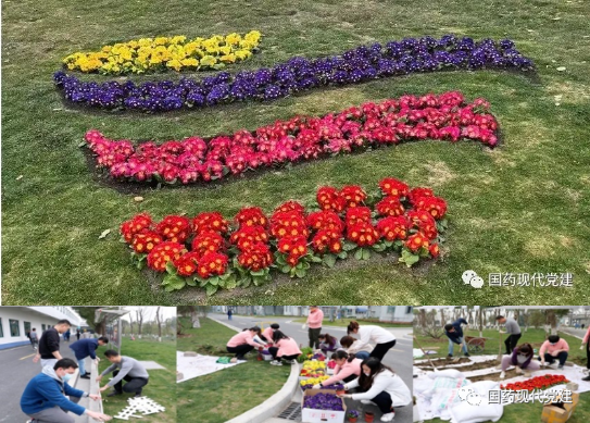 在国药现代总部办公区域草坪内,开展景观花坛栽种义务劳动。团员青年以鲜花为笔、草地为纸,画出色彩绚丽的国药集团“关爱生命·呵护健康”的品牌LOGO,绘就出一道靓丽的绿色风景线,给景观花坛增添了勃勃生机,彰显国药现代企业文化。